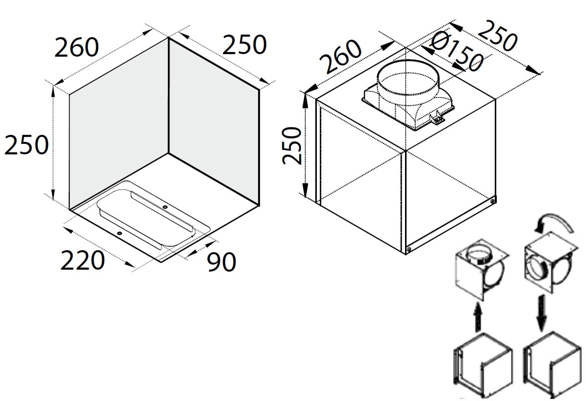 För invändig montering i skåp. Möjlighet till frånluftsutsläpp bakåt och upp. Levereras med 1,5m kabel