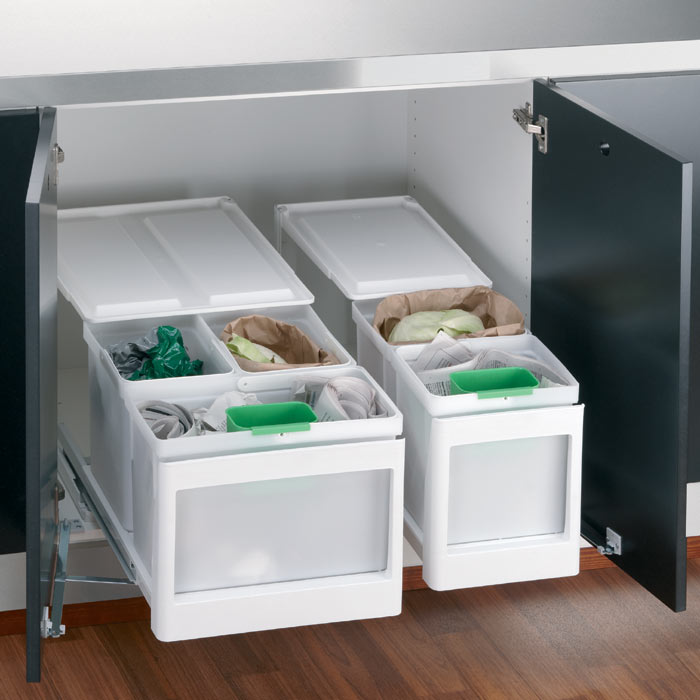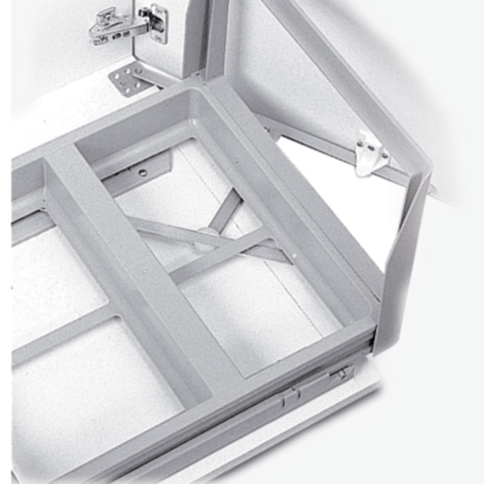 Dörrmekanism för 1K + 2PK. Kan fästas på modellerna Eico 1K och Eico 2PK. Drar ut avfallshinken, när luckan öppnas. Kan fästas på både vänsteroch högerhängda luckor. För att detta ska fungera måste dock systemet placeras 10 cm från skåpsidan