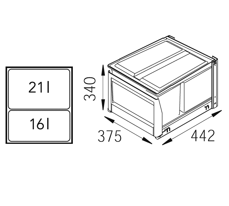 Källsortering med lock. Välfungerande system för montering i botten av skåpet. Passar i skåp som är 50 cm 1x16 l hink 1x21 l hink. Dörrmekanism kan levereras som extra tillbehör
