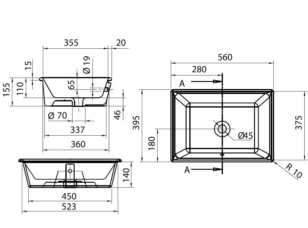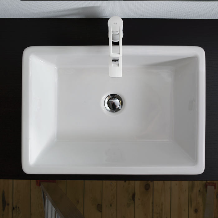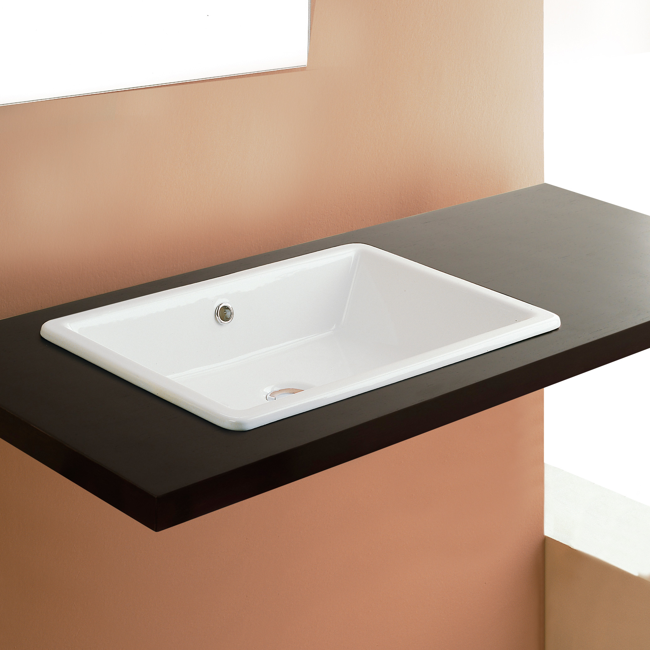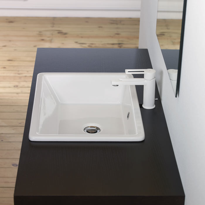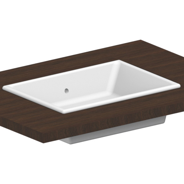 Tvättställ i porslin. För nedfällnad i skiva. Med breddavlopp. Enkelt tvättställ. NB: Tag kontakt för att få ritning för utskärning. Då materialet är porslin kan måtten variera. Därför rekomenderas det alltid, att produkten är fysiskt närvarande.