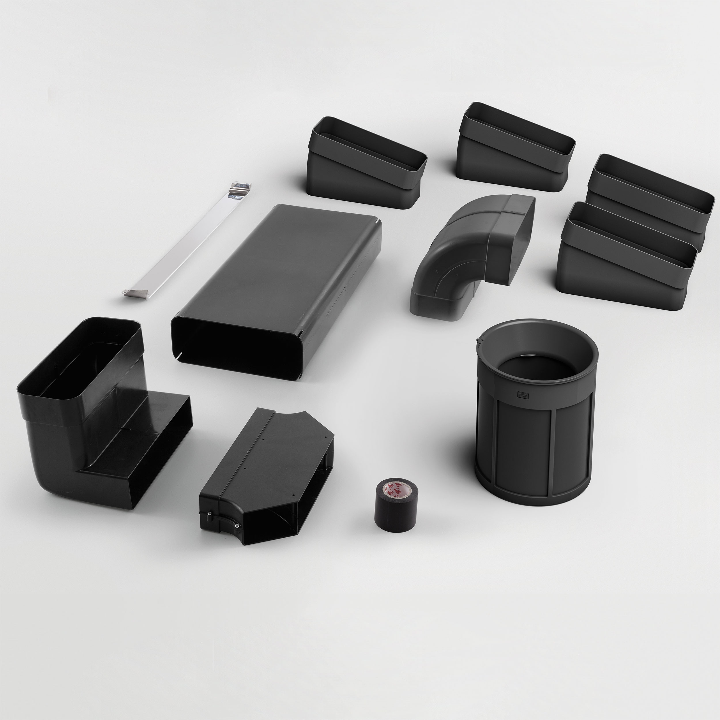- Praktiskt installationskit som gör det enkelt att omvandla din fläkt till en effektiv lösning utan frånluft. Detta kit är för recirkulation med utblåsning i sockelutrymmet. Innehåller standardrör och tillbehör som säkerställer effektiv och tyst ventilation. Vid rörlängder över standard kan extra rör köpas separat.
