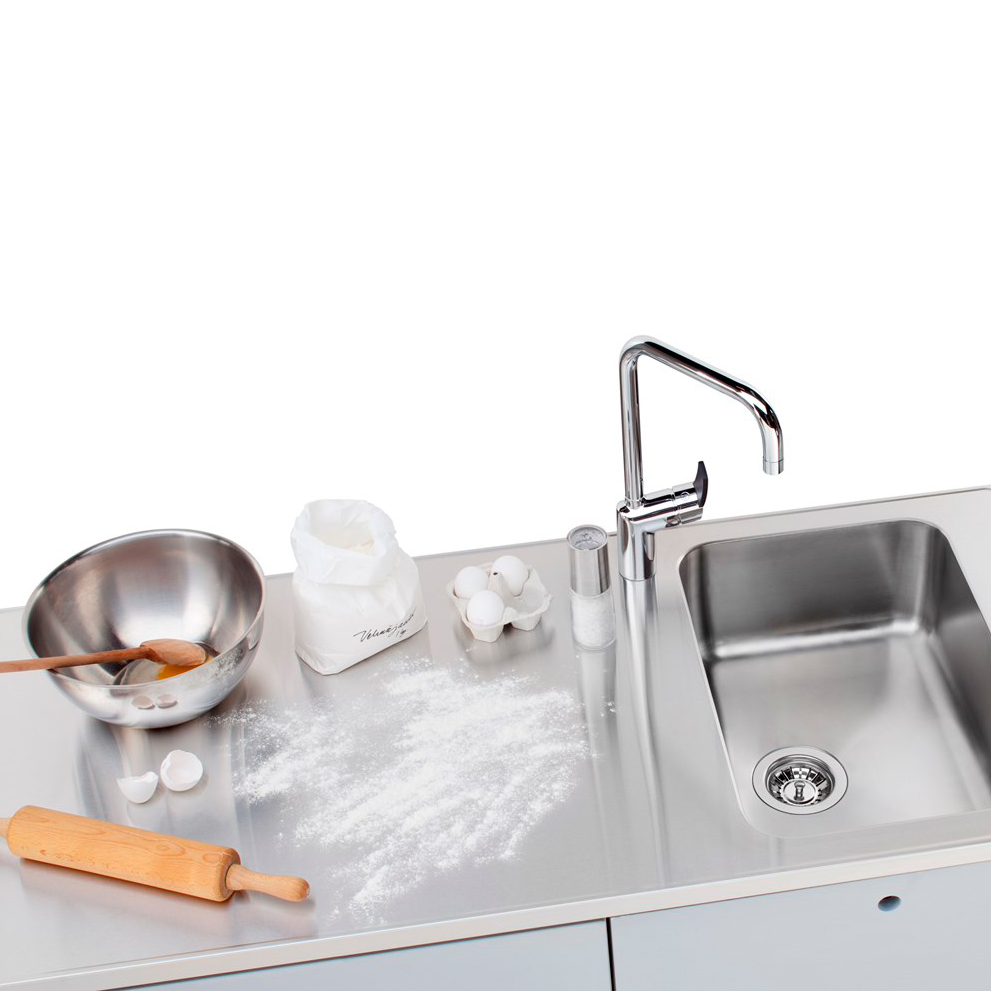 Seven E, Bänkskiva med diskho. Bänkskiva med enkel diskho Längd - specialanpassning av mått med 5 mm intervall. Plan eller upphöjd kantprofil. Ytan är som standard slät. Dekormönster beställs som extra utrustning. Korgventil kan beställas. Stålbakkant kan levereras för montering. Kanten är 58 mm höjd. Hål för blandare kan beställas