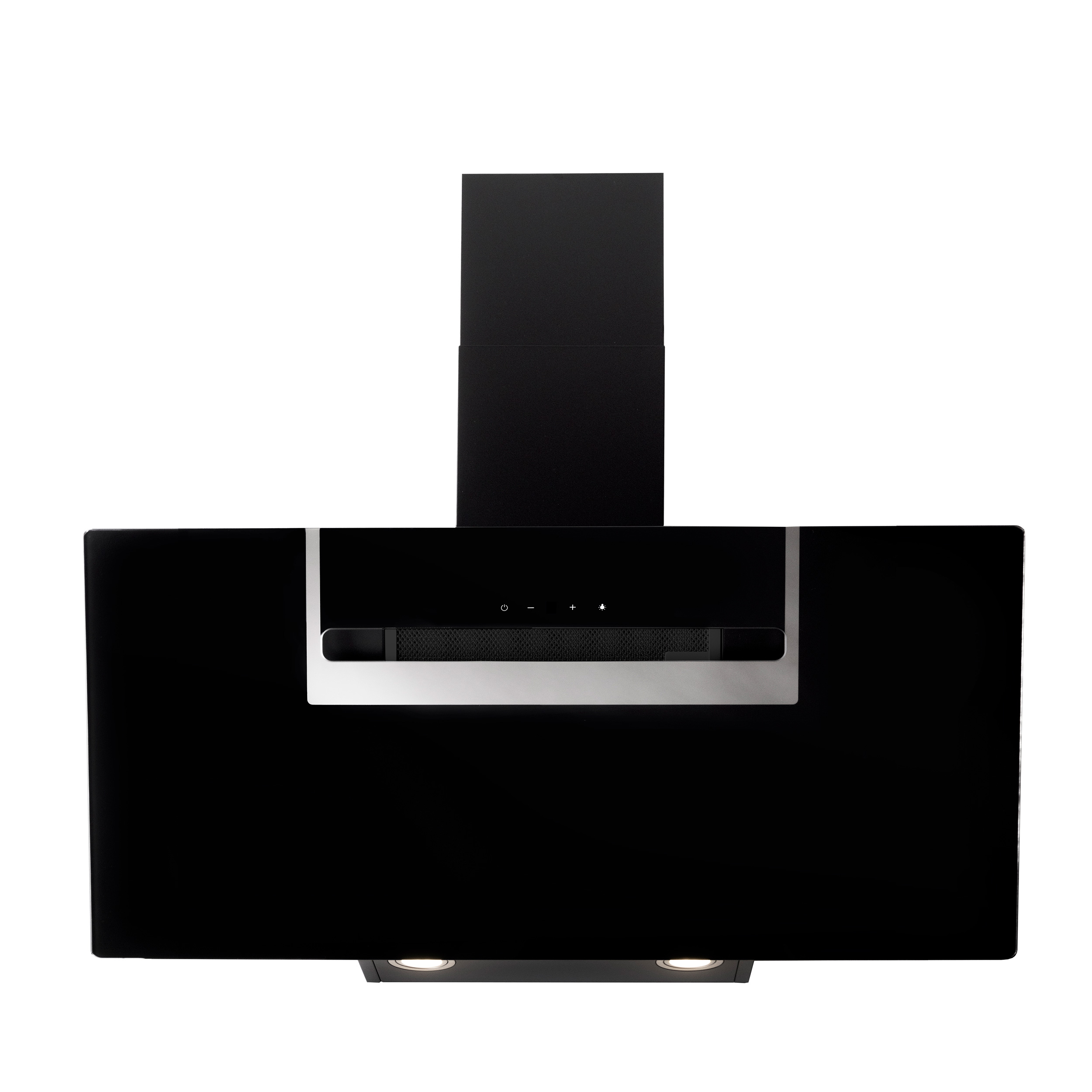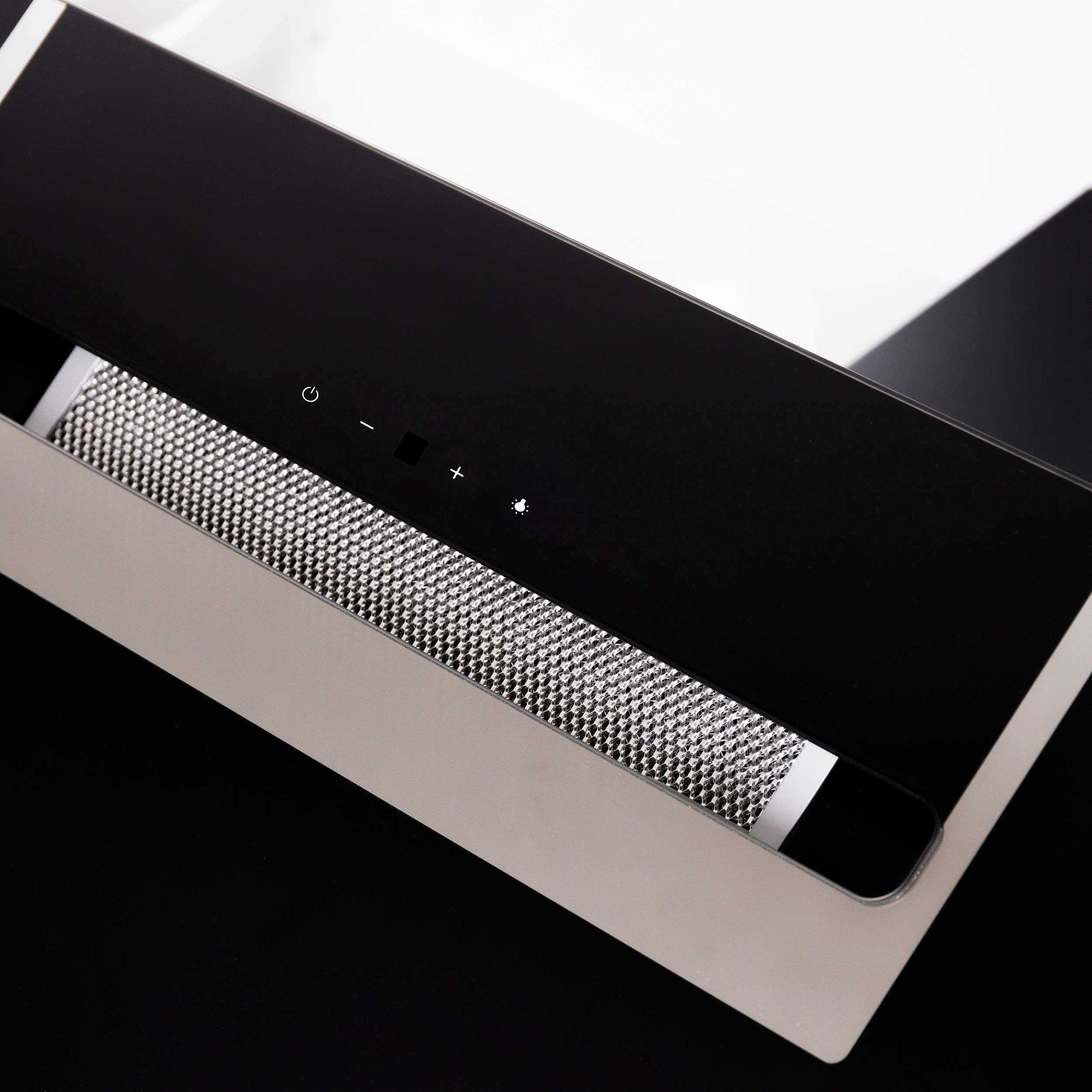 Väggmonterad köksfläkt, vertikal. Med inbyggd motor - Svart glas/spegellist - 800mm - A++