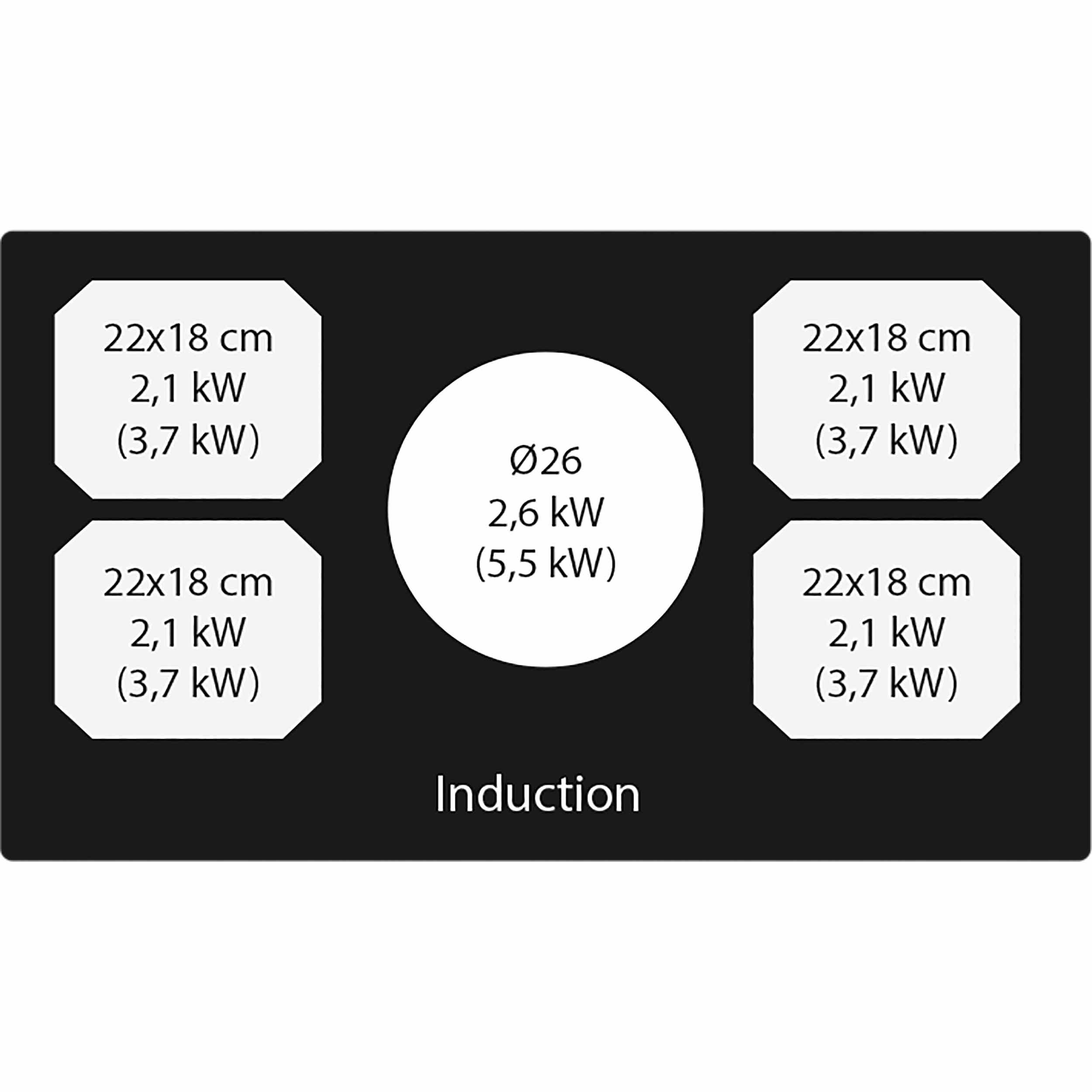 I båda sidor kan främre kokzon och bakre zonen kombineras till att användas som en stor kokzon på 22x36cm