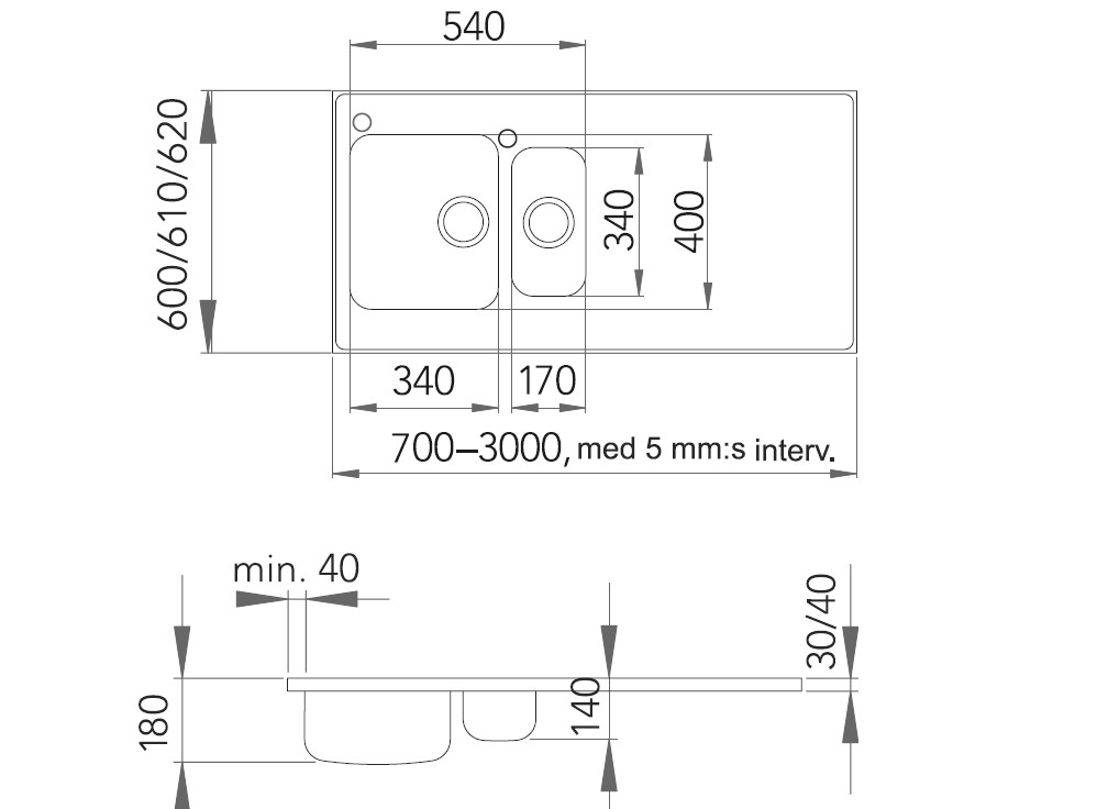 - Märk: Levereras endast i tillgängliga längder - max. 3000 mm_x000D_ Diskhon kan placeras efter önskemål_x000D_ Måste dock sitta minst 40 mm från kant