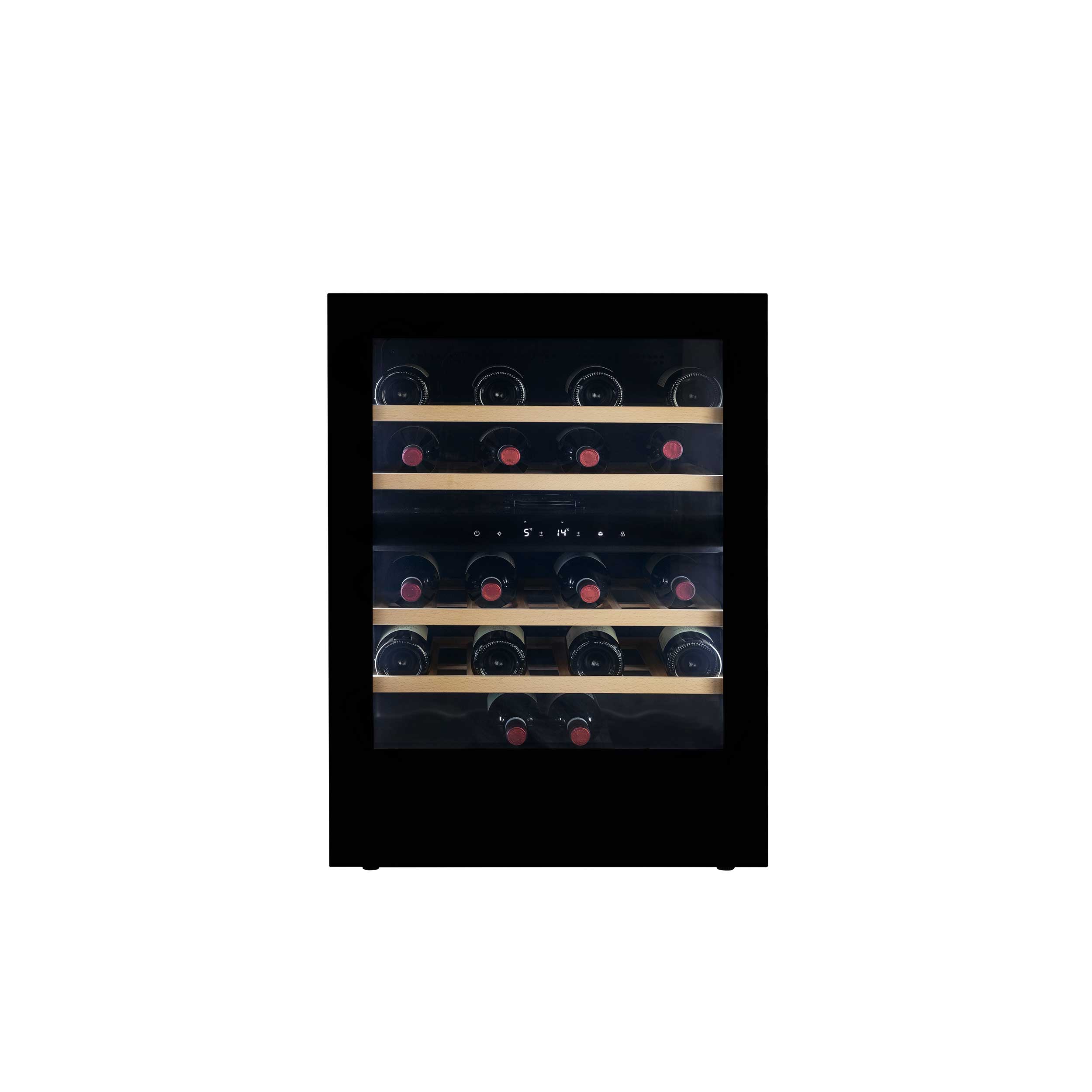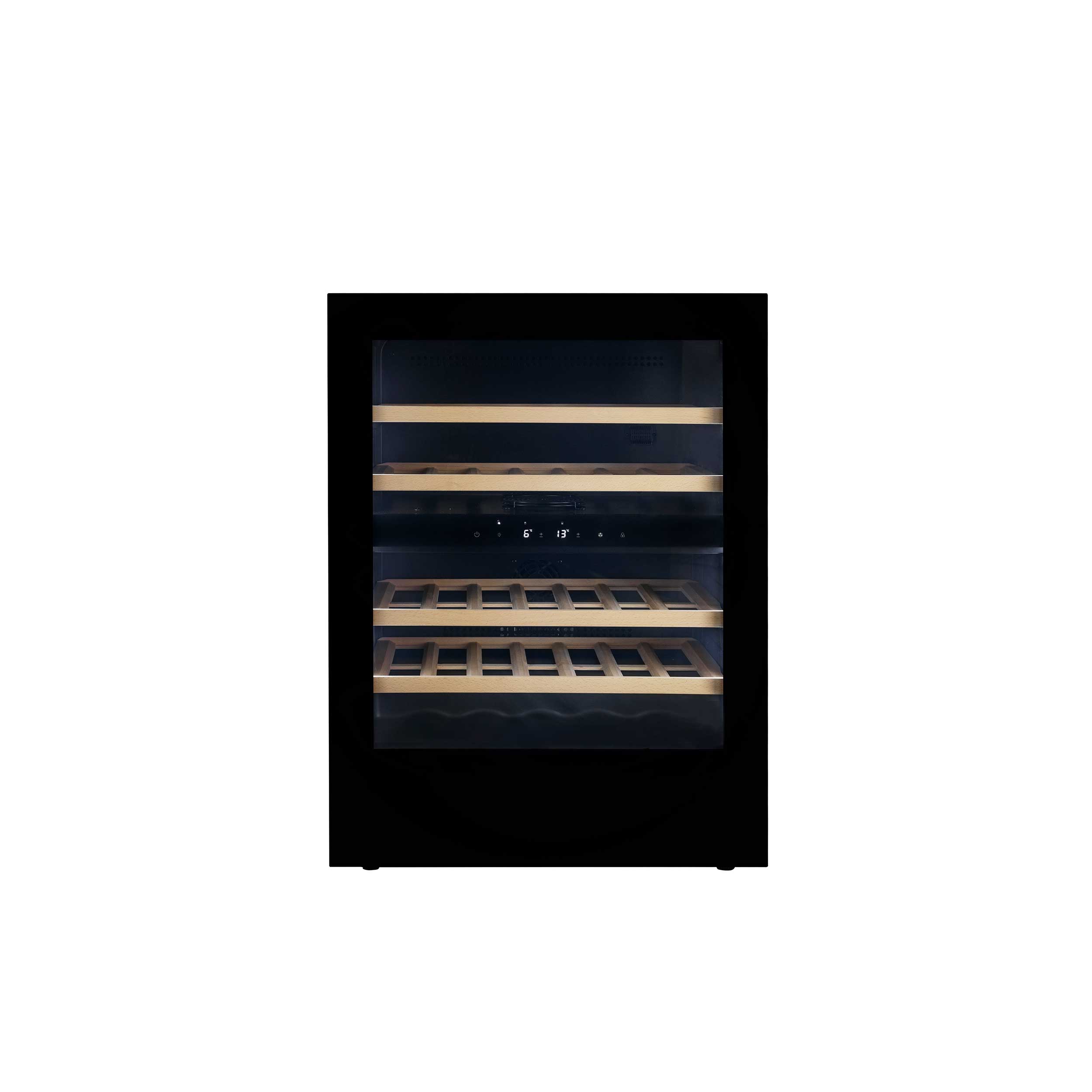 Vinkylskåpets fläkt (vanligtvis på större skåp) säkrar att den kalla luften cirkuleras runt i zonen och kylningen med kompressorteknologi säkrar en konstant och jämn temperatur.